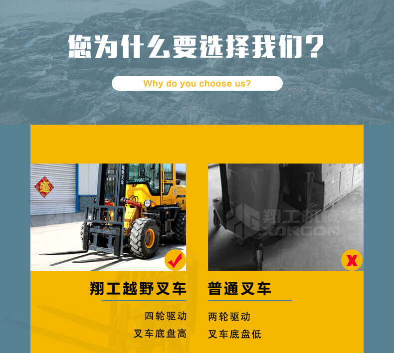 3.普通叉车只能在平整的路面上作业,而越野叉车既可以在普通路面上作业,还可以在山路泥路崎岖道路作业,轮胎抓地力强,不打滑。